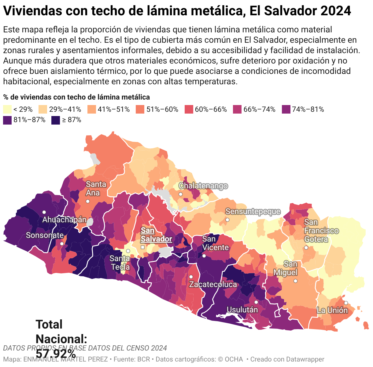 Este mapa refleja la proporción de viviendas que tienen lámina metálica como material predominante en el techo. Es el tipo de cubierta más común en El Salvador, especialmente en zonas rurales y asentamientos informales, debido a su accesibilidad y facilidad de instalación. Aunque más duradera que otros materiales económicos, sufre deterioro por oxidación y no ofrece buen aislamiento térmico, por lo que puede asociarse a condiciones de incomodidad habitacional, especialmente en zonas con altas temperaturas.