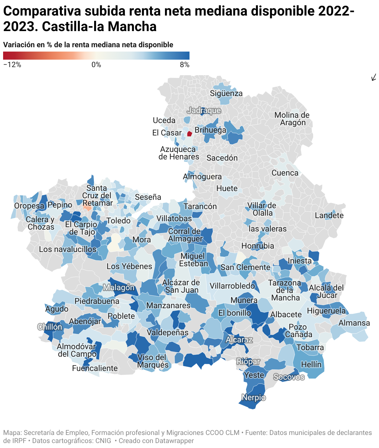 Comparativa subida renta neta mediana disponible 2022-2023. Castilla-la Mancha