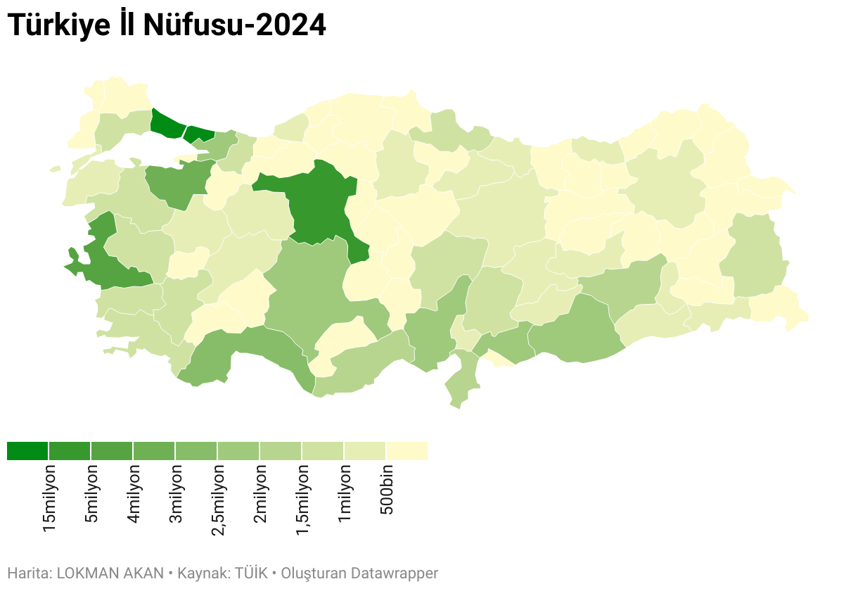 Türkiye'de illerin 2024 yılını kapsayan toplam nüfuslarını gösterir.