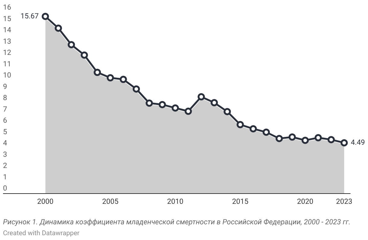 Рисунок 1. Динамика коэффициента младенческой смертности в Российской Федерации, 2000 - 2023 гг.