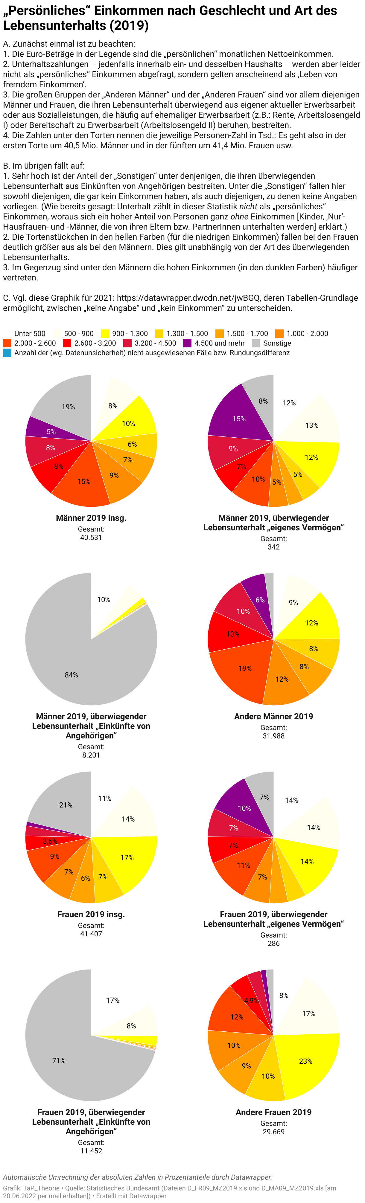 2. Die Tortenstückchen in den hellen Farben (für die niedrigen Einkommen) fallen bei den Frauen deutlich größer aus als bei den Männern. Dies gilt unabhängig von der Art des überwiegenden Lebensunterhalts.