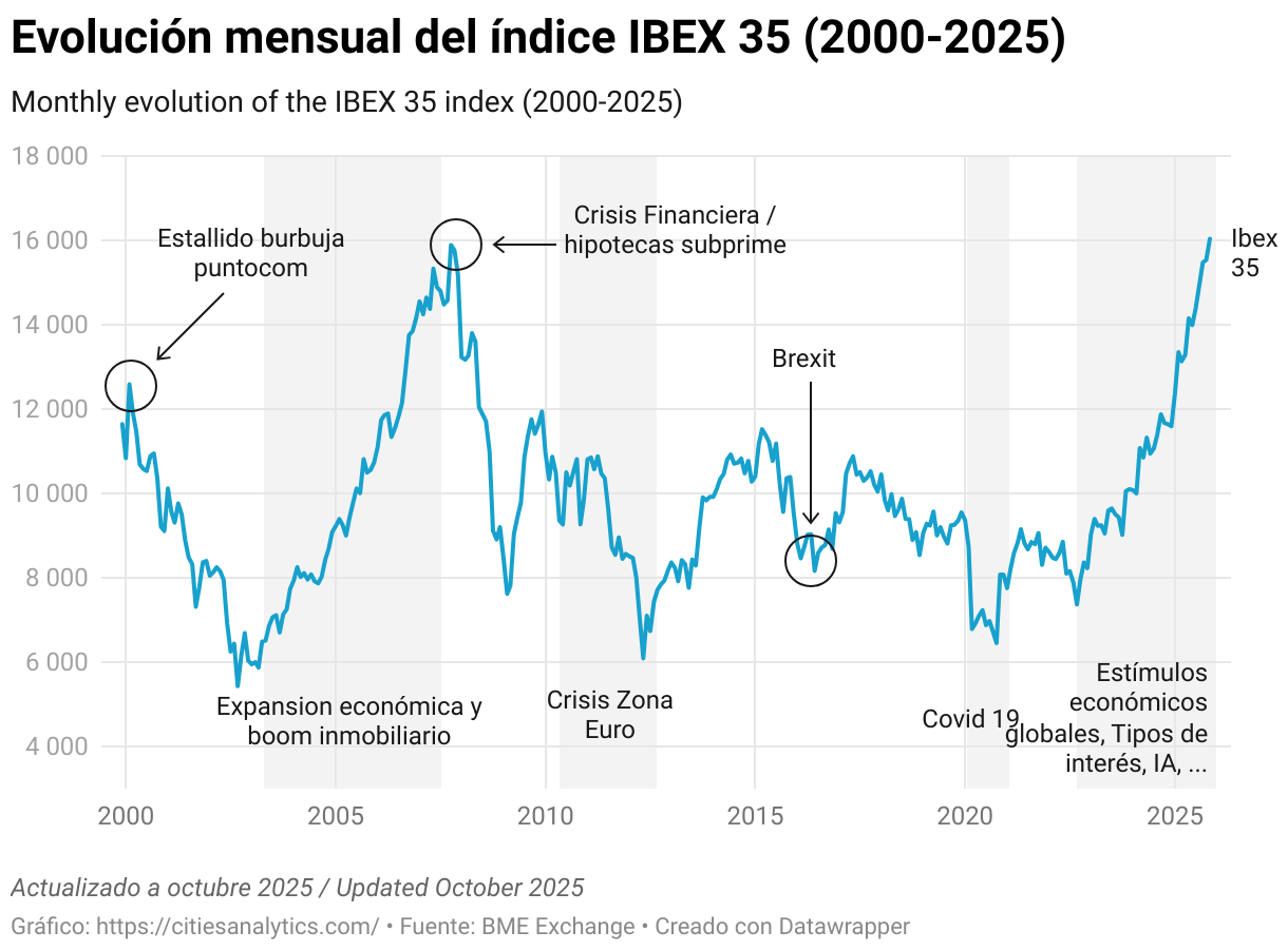 Monthly evolution of the IBEX 35 index (2000-2025)