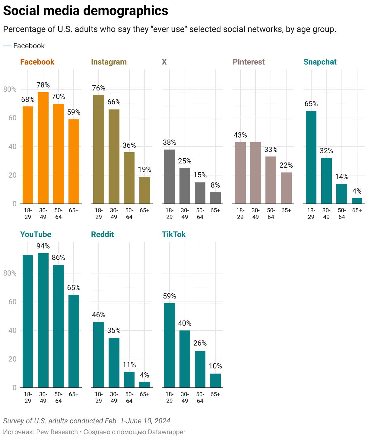 Percentage of U.S. adults who say they "ever use" selected social networks, by age group.