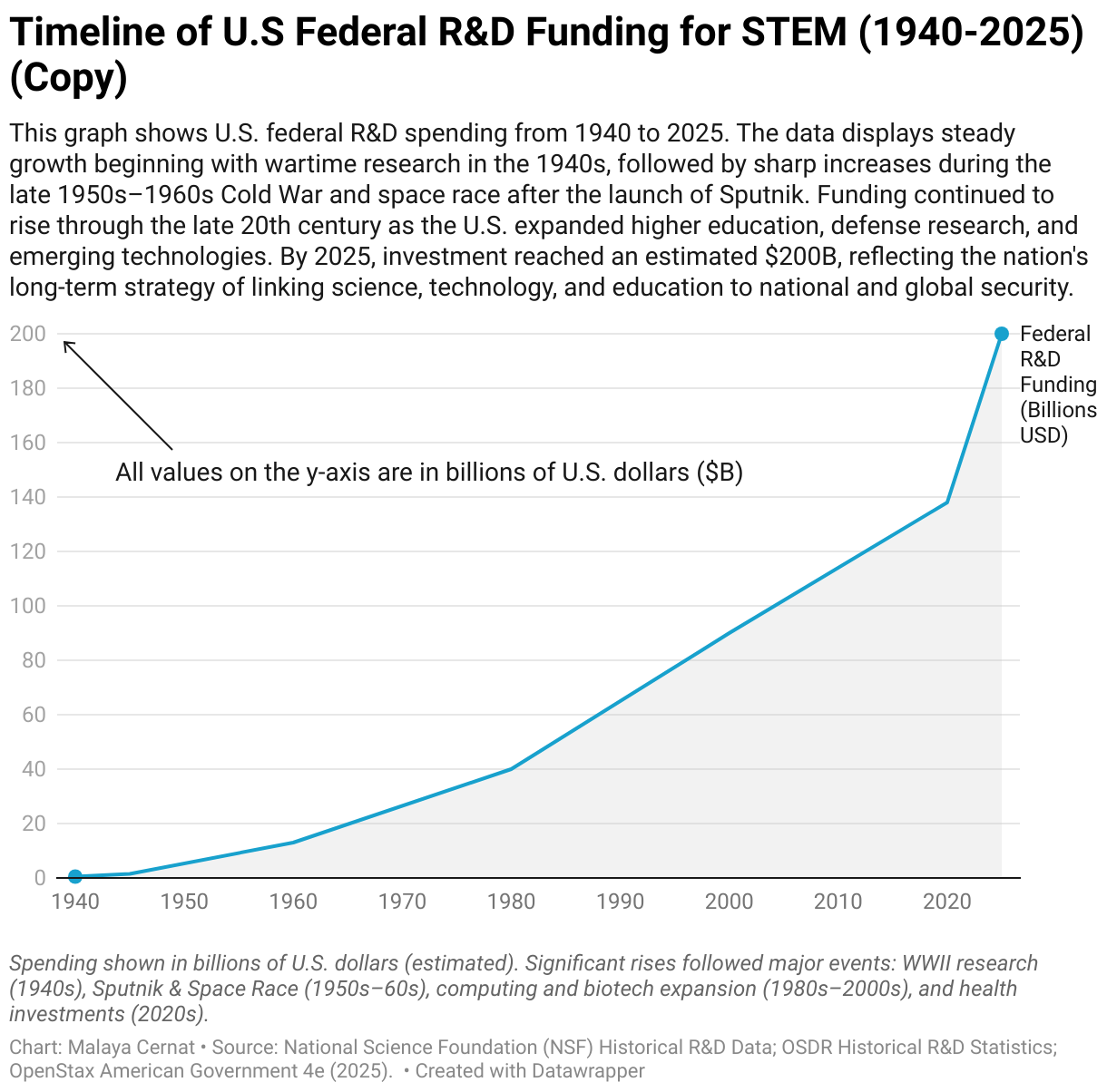 This graph shows U.S. federal R&D spending from 1940 to 2025. The data displays steady growth beginning with wartime research in the 1940s, followed by sharp increases during the late 1950s–1960s Cold War and space race after the launch of Sputnik. Funding continued to rise through the late 20th century as the U.S. expanded higher education, defense research, and emerging technologies. By 2025, investment reached an estimated $200B, reflecting the nation's long-term strategy of linking science, technology, and education to national and global security.