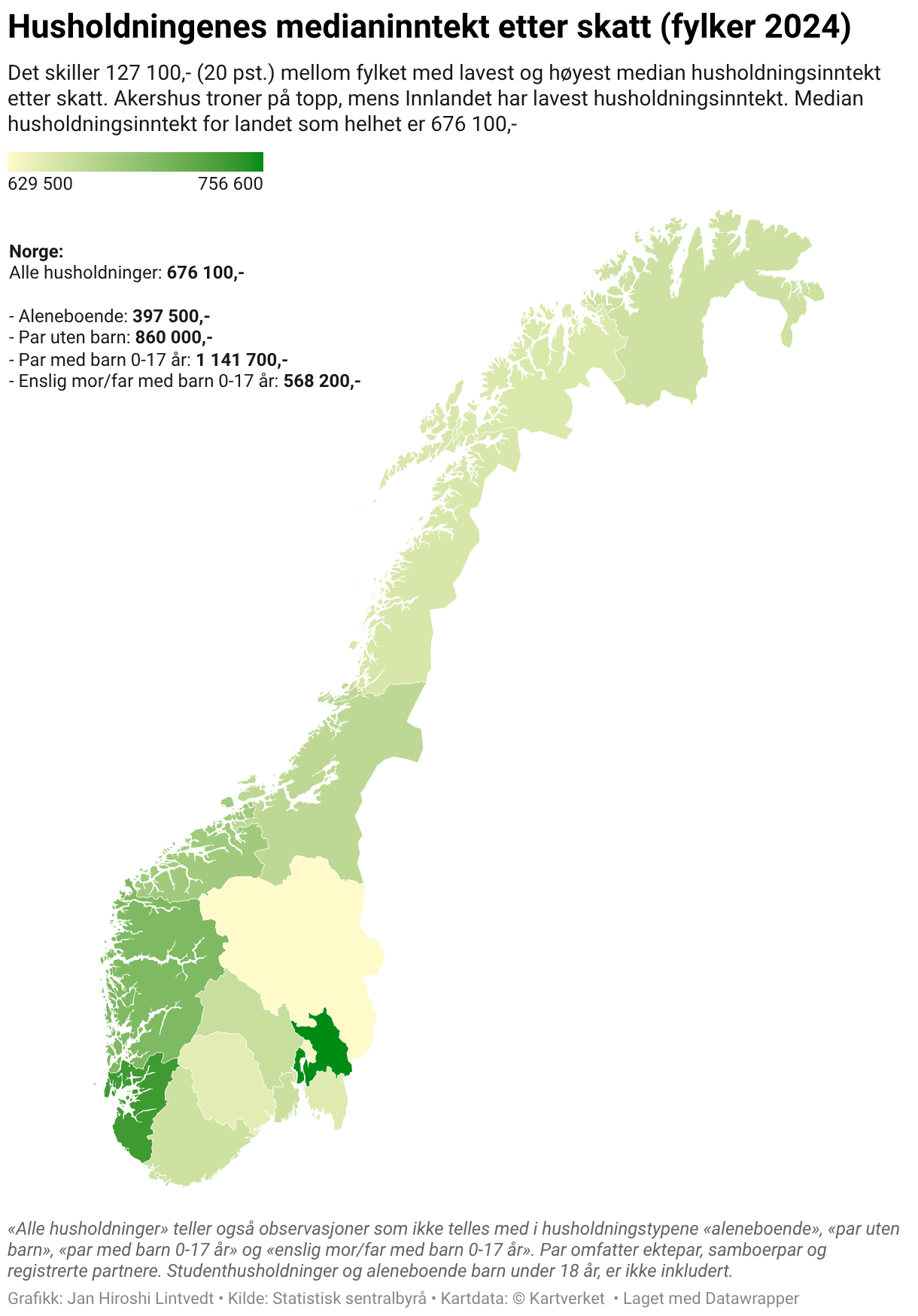 Det skiller 127 100,- (20 pst.) mellom fylket med lavest og høyest median husholdningsinntekt etter skatt. Akershus troner på topp, mens Innlandet har lavest husholdningsinntekt. Median husholdningsinntekt for landet som helhet er 676 100,-