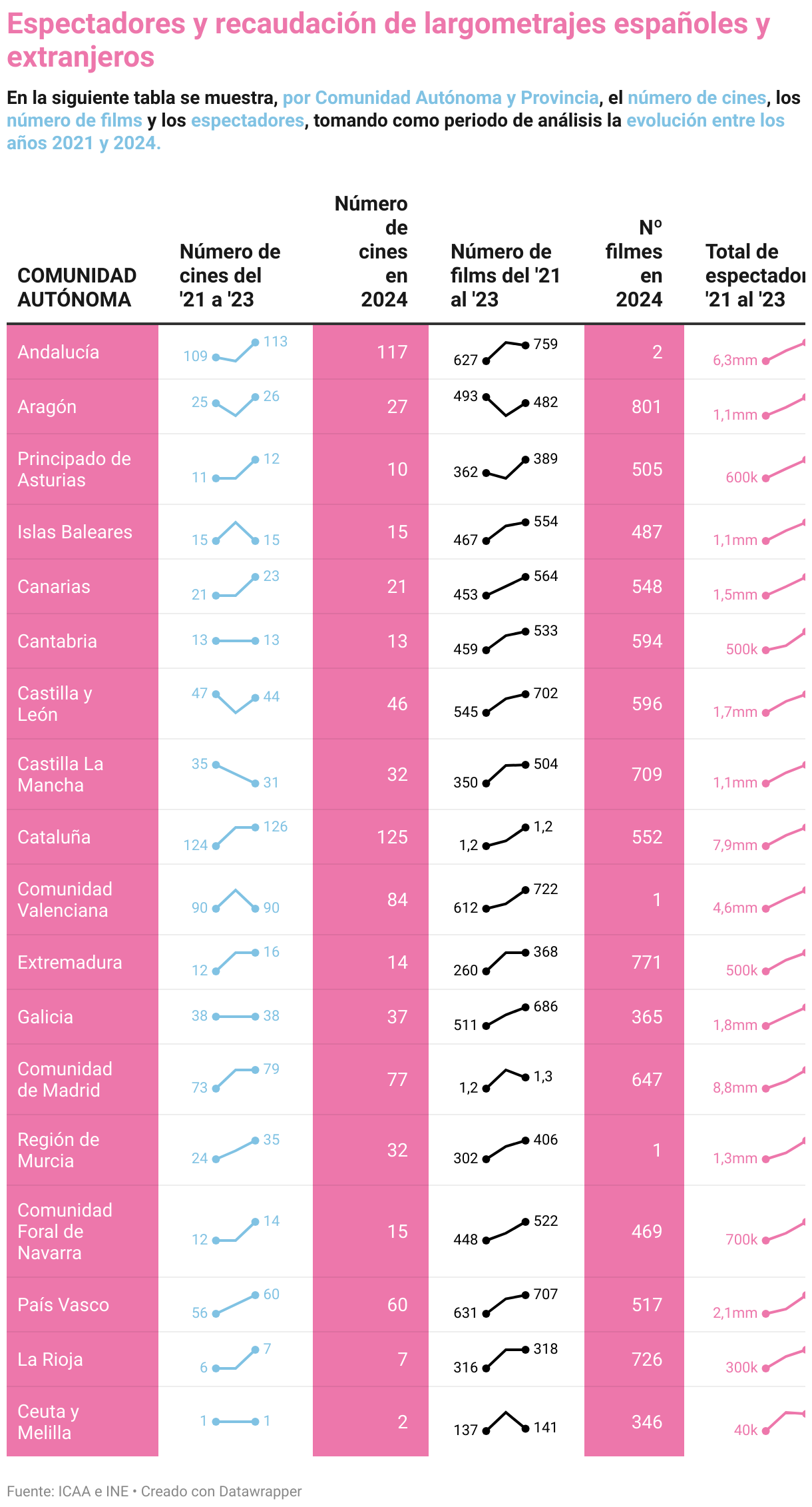 En la siguiente tabla se muestra, por Comunidad Autónoma y Provincia, el número de cines, los número de films y los espectadores, tomando como periodo de análisis la evolución entre los años 2021 y 2024.
