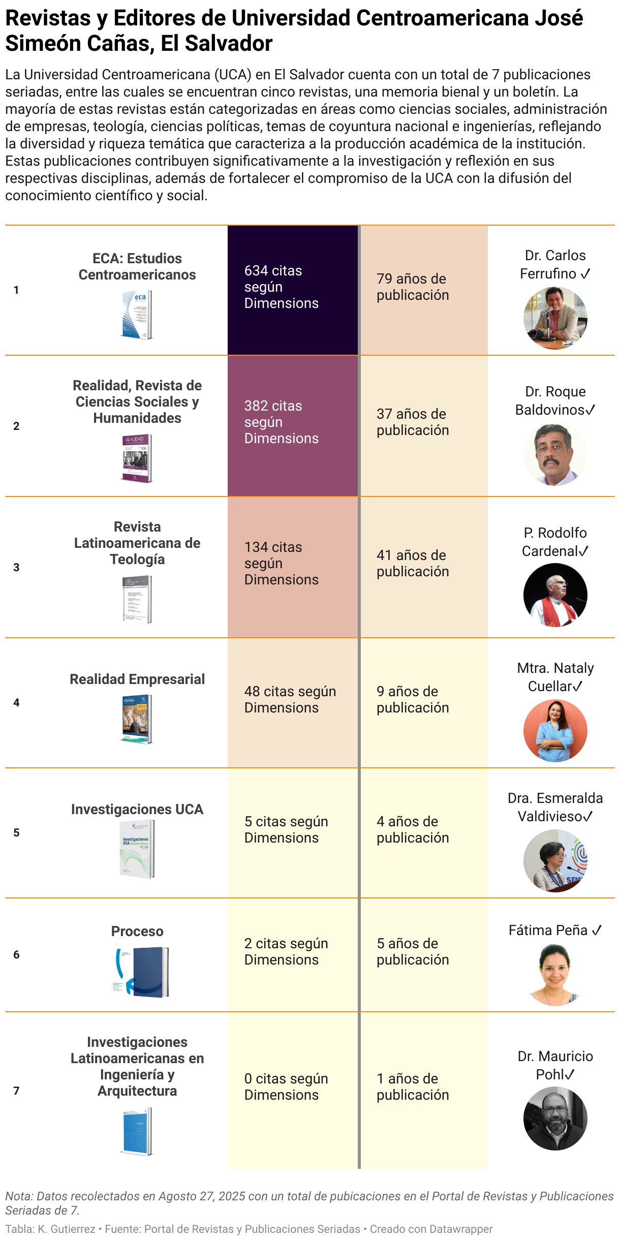 La Universidad Centroamericana (UCA) en El Salvador cuenta con un total de 7 publicaciones seriadas, entre las cuales se encuentran cinco revistas, una memoria bienal y un boletín. La mayoría de estas revistas están categorizadas en áreas como ciencias sociales, administración de empresas, teología, ciencias políticas, temas de coyuntura nacional e ingenierías, reflejando la diversidad y riqueza temática que caracteriza a la producción académica de la institución. Estas publicaciones contribuyen significativamente a la investigación y reflexión en sus respectivas disciplinas, además de fortalecer el compromiso de la UCA con la difusión del conocimiento científico y social.